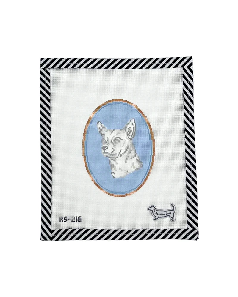 This is a hand painted needlepoint canvas by Rooney and Stitch from Atlantic Blue Canvas featuring and blue white cameo of a chihuahua dog.