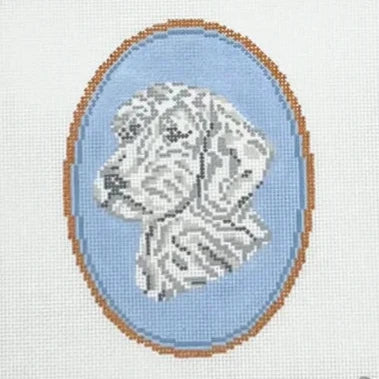 This hand painted needlepoint canvas by Rooney and Stitch for Atlantic Blue Canvas features a blue and white Wedgwood Jasperware inspired cameo of a doodle.