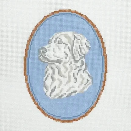 This hand painted needlepoint canvas by Rooney and Stitch for Atlantic Blue Canvas features a blue and white Wedgwood Jasperware inspired cameo of a golden retriever.