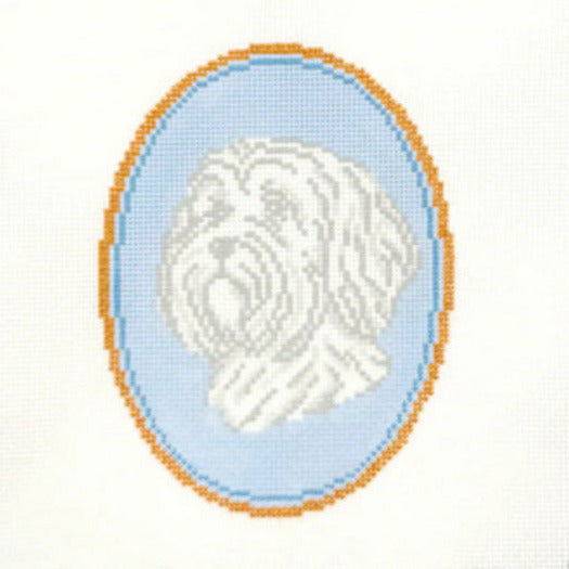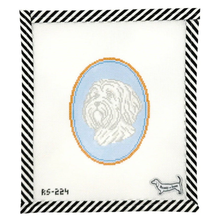 This is a hand painted canvas from Rooney and Stitch for Atlantic Blue Canvas. It features a blue and white Wedgwood Jasperware inspired cameo of a Havanese Dog.