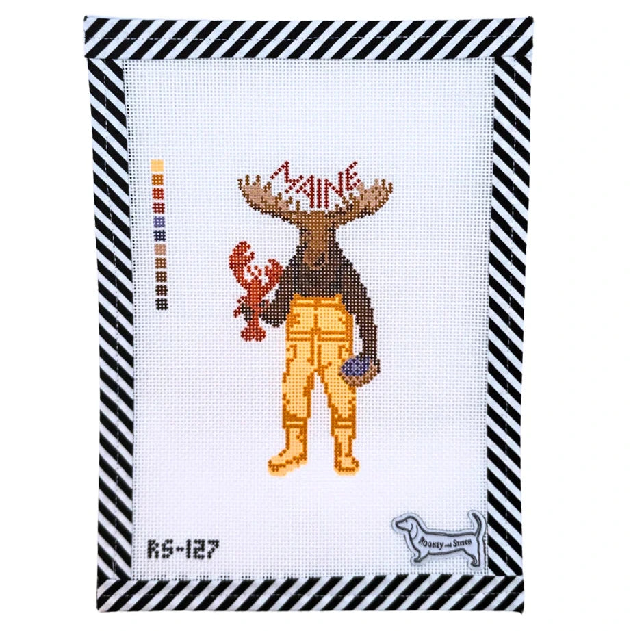 This is a hand painted needlepoint canvas by Rooney & Stitch from Atlantic Blue Canvas. It features a humanoid moose in fisherman's gear carrying a lobster.