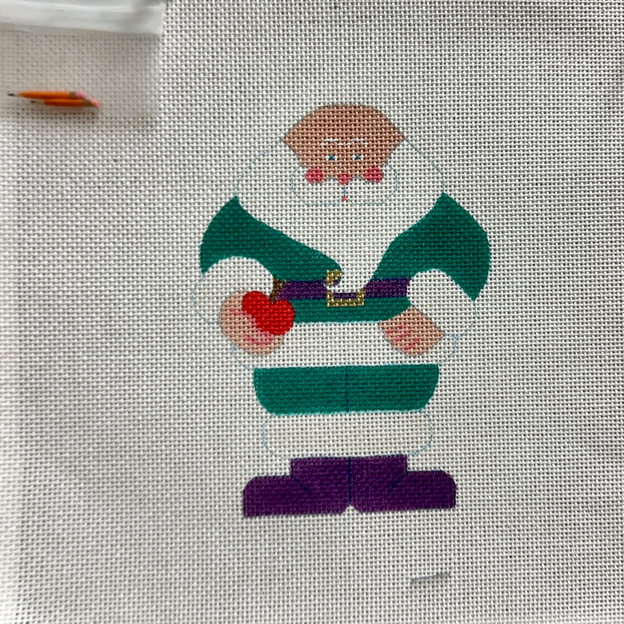 This hand painted needlepoint canvas by Rittenhouse Needlepoint features a Santa ready for school with and apple for teacher and pencil embellishments.