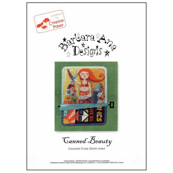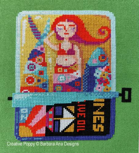 This is a printed cross stitch pattern by Barbara Ana Designs. It features an old fashioned can of sardines partially unrolled, with a red-headed mermaid nestled between two fish. The example as stitched uses DMC cotton floss on 28 ct cotton Linda evenweave in the color Grass Green.
