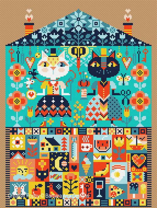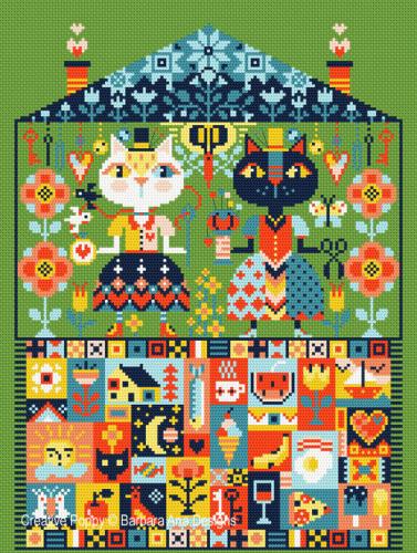 This is a printed cross stitch pattern by Barbara Ana Designs. It features two cats busy with their favorite needlework activities. The pattern offers two alternative charts, one with an added turquoise background. The example as stitched uses DMC cotton floss on 28 ct cotton Linda evenweave in the color Grass Green.