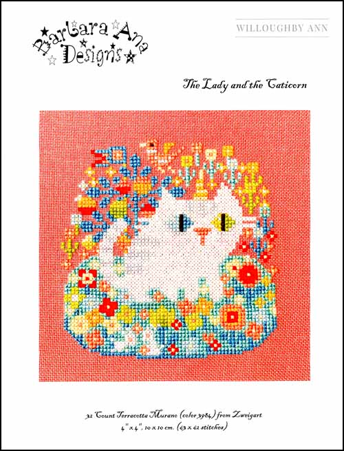 This is a printed cross stitch pattern from Barbara Ana Designs featuring a mythical cat unicorn in a bed of colorful flowers. As stitched, it uses DMC floss.