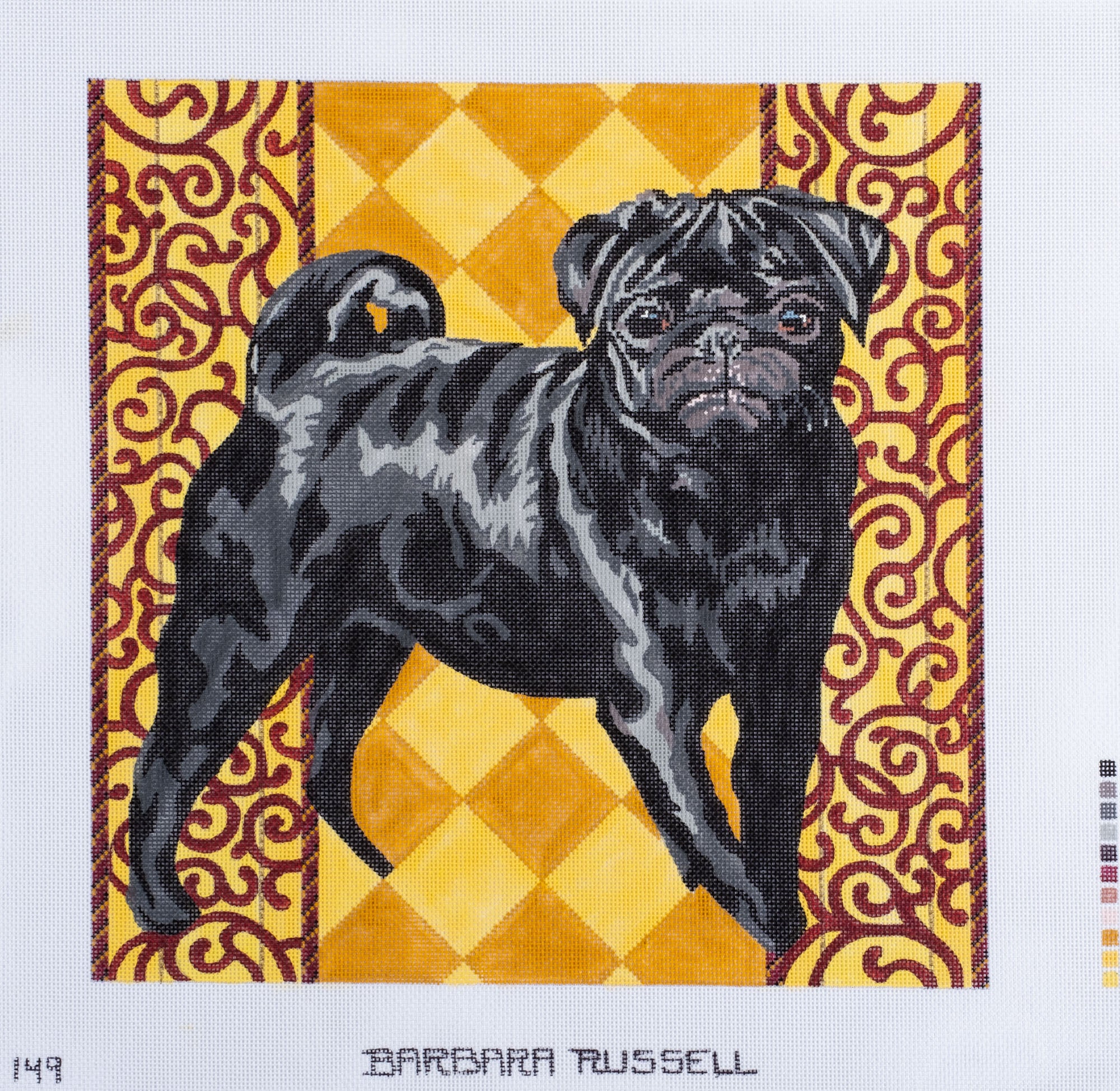 Barbara Russell Black Pug Dog on Gold Needlepoint Canvas