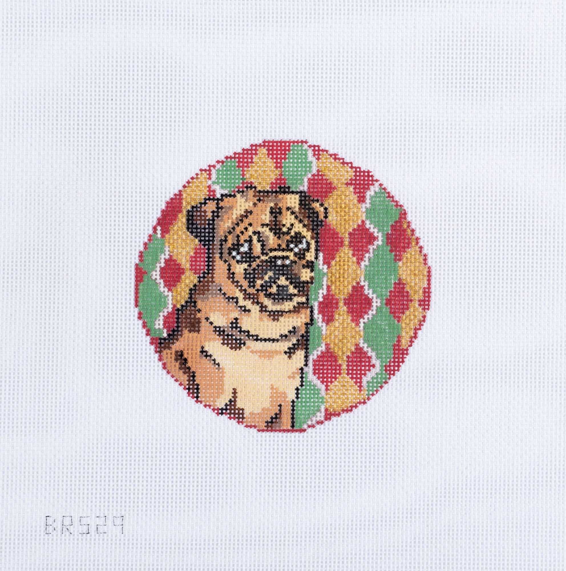 Barbara Russell Brown Pug Dog Round Needlepoint Canvas
