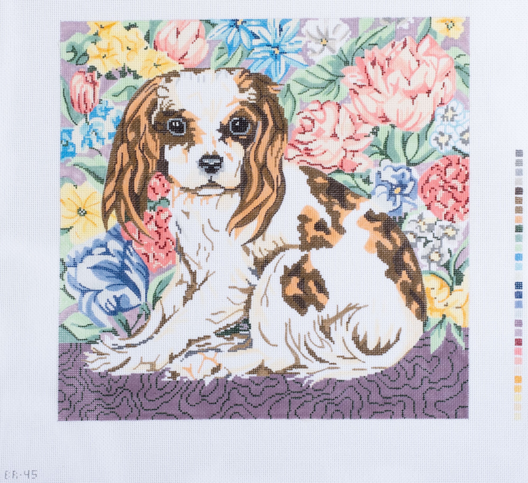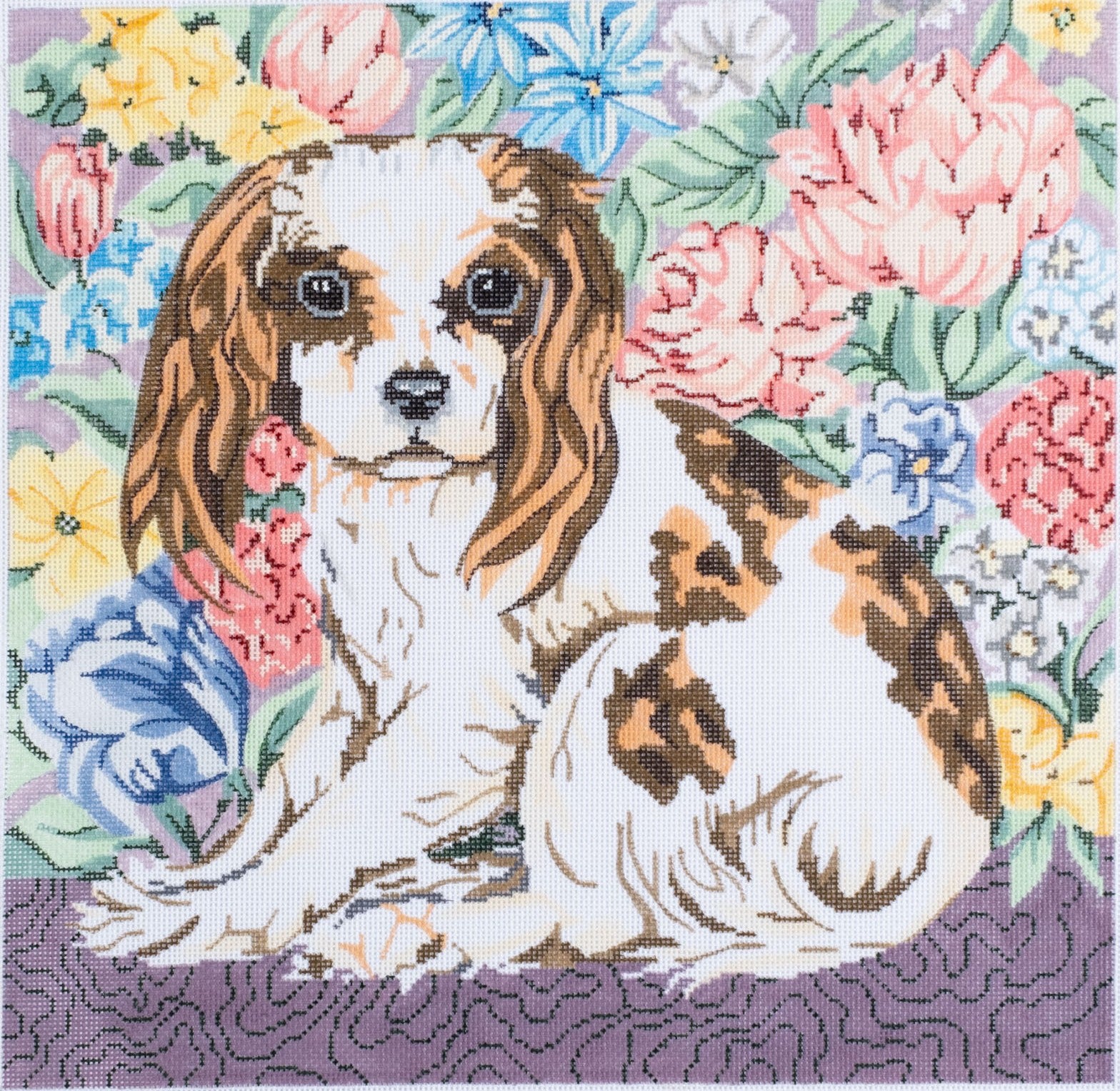 Barbara Russell Designs Cavalier King Charles Spaniel Dog with Flowers 18m Needlepoint Canvas