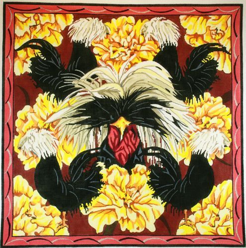 Barbara Russell Five Black Crested Fowl and Flowers Needlepoint Canvas
