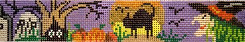 A beautiful hand painted needlepoint canvas from Patti Mann featuring classic Halloween motifs including a witch and a black cat. Finished belt shown for inspiration, thread and other materials not included.