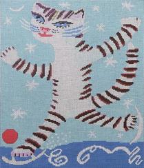 A beautiful hand painted needlepoint design from Birds of a Feather featuring two golden retrievers in the back of an old red pickup truck draped with an American flag.