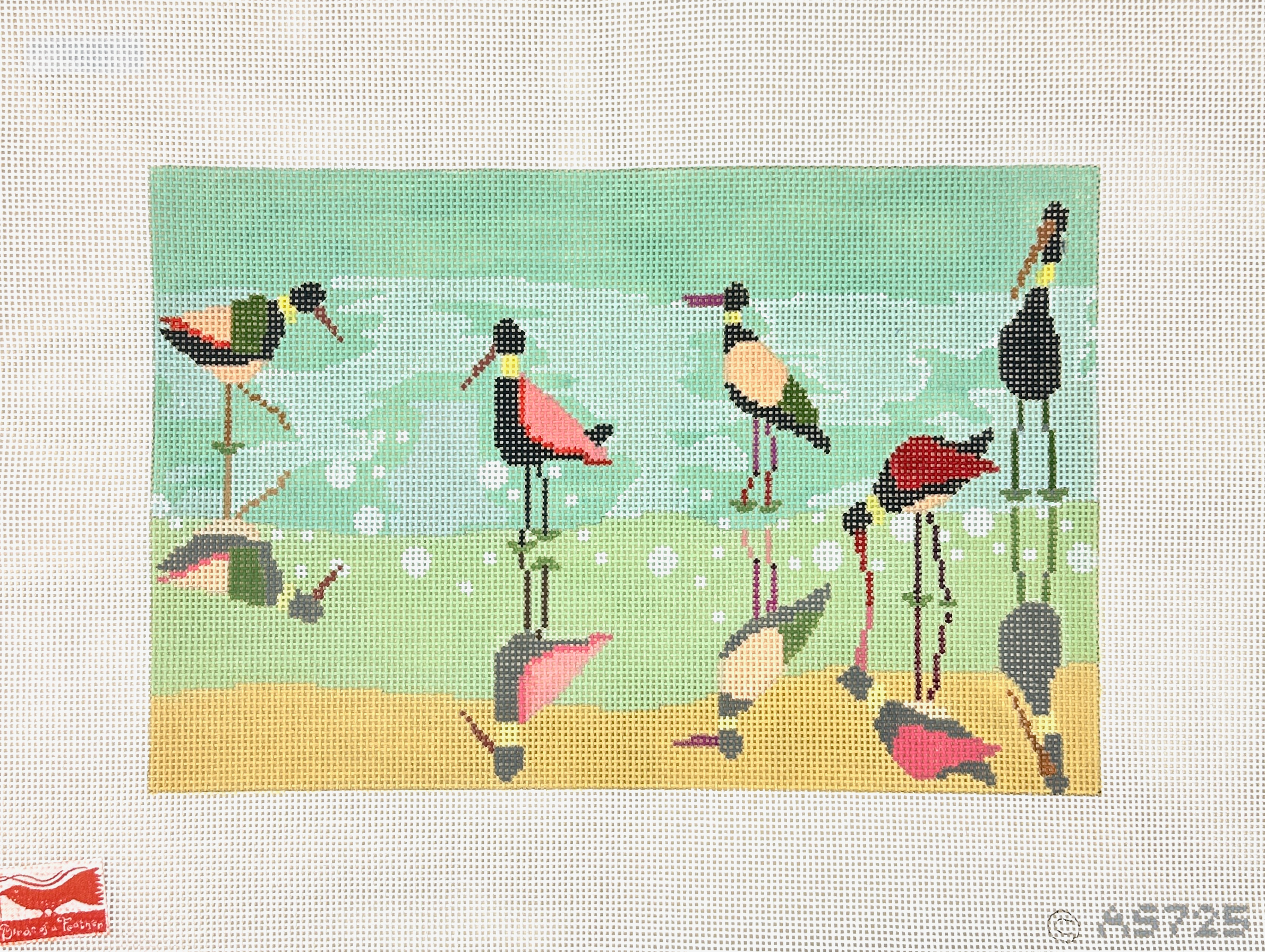 This is a hand painted needlepoint canvas by Amy Schimler-Safford from Birds of a Feather featuring a painting of a small gathering of birds wandering along the shoreline.