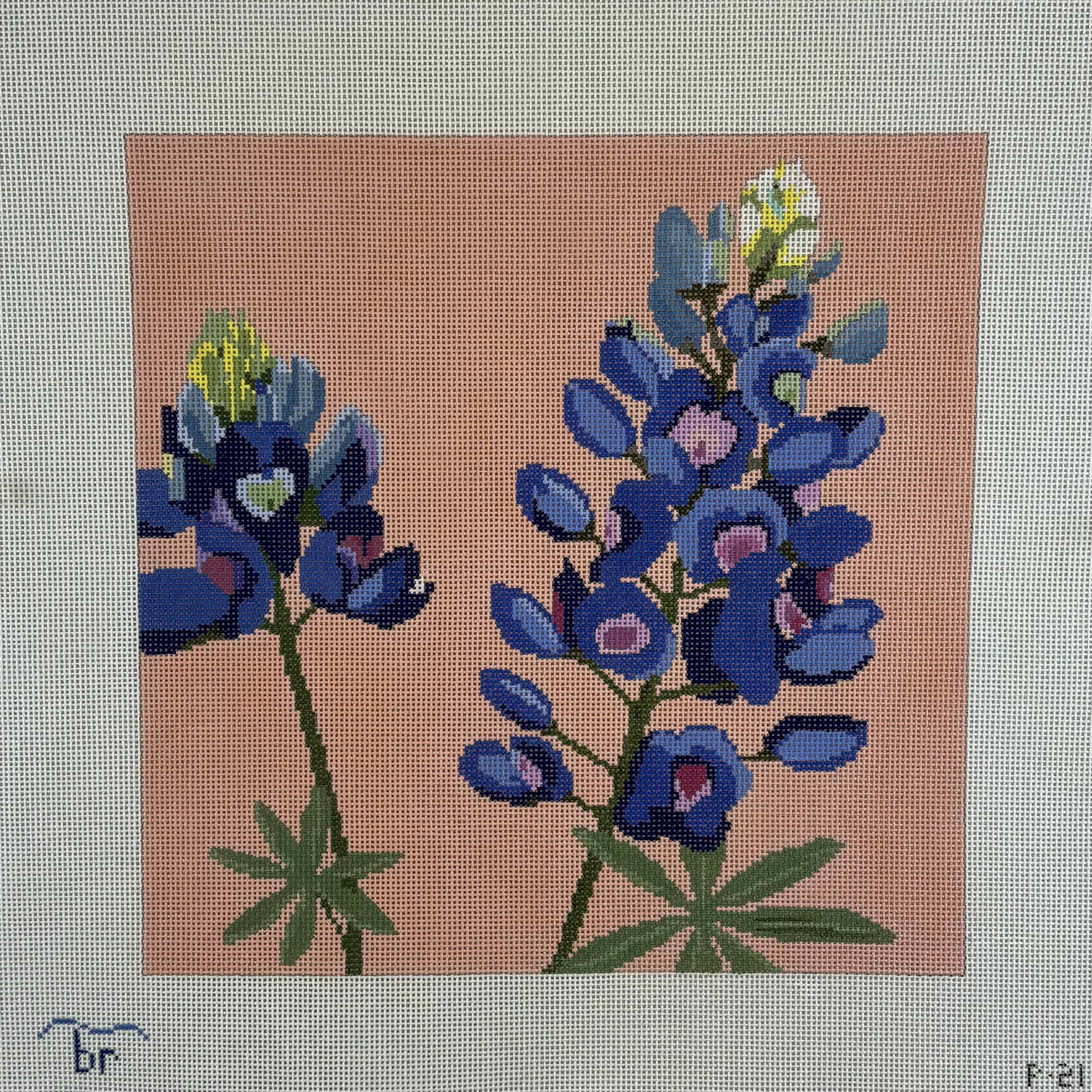 This hand painted needlepoint canvas from Blue Ridge Stitchery features vibrant bluebonnet flowers on a peach background.