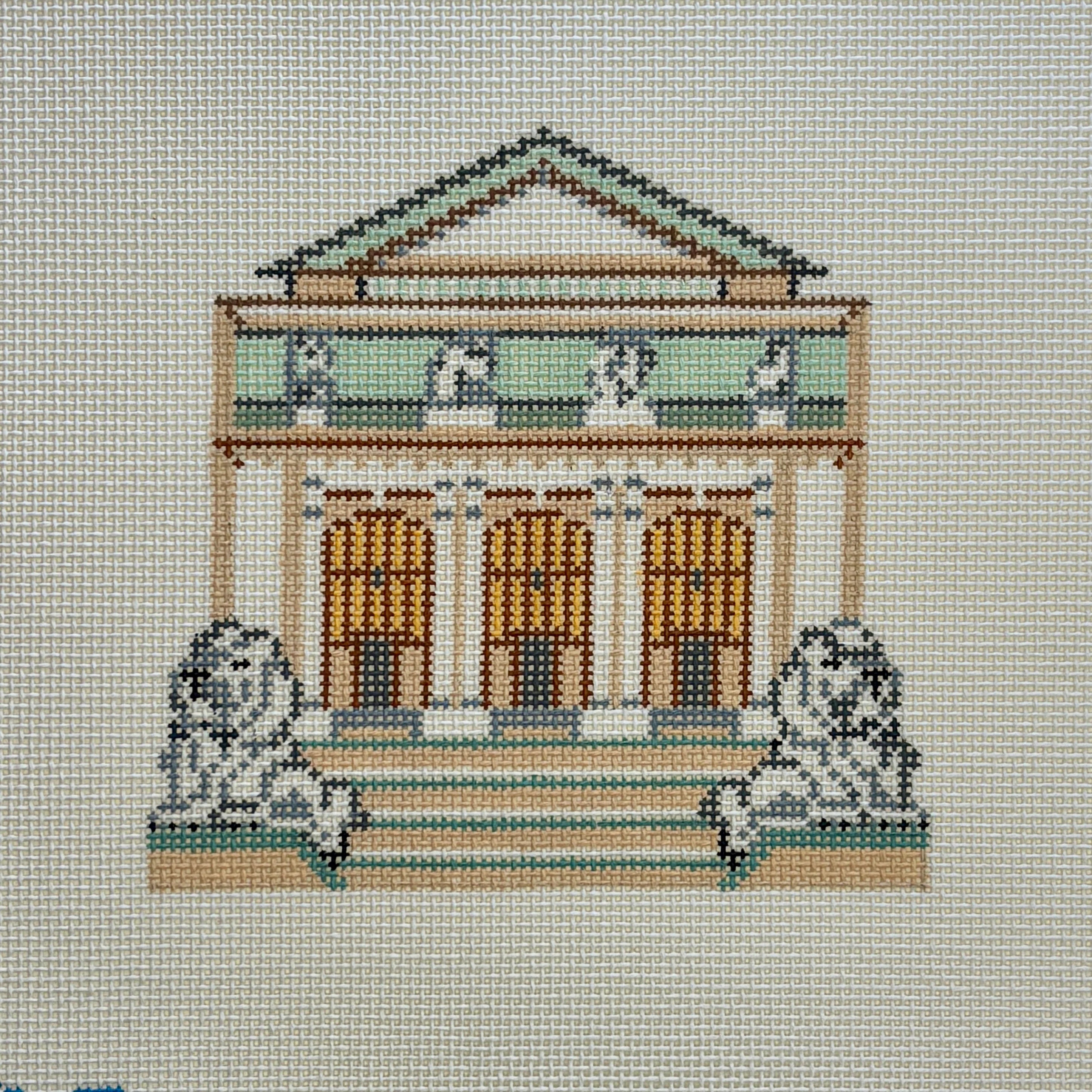 This hand painted needlepoint canvas from Blue Ridge Stitchery features the handsome New York Public Library main branch in NYC.