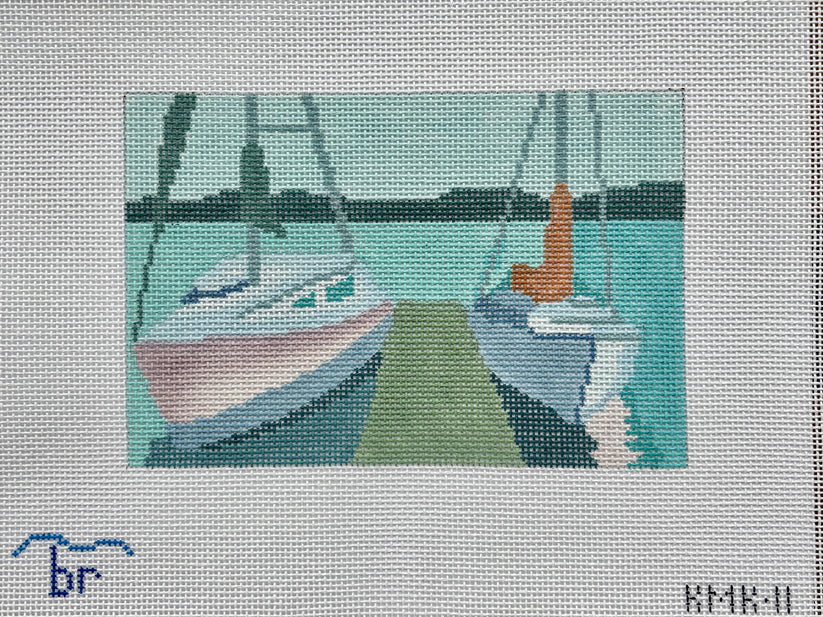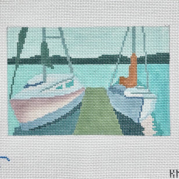This is a hand painted needlepoint canvas by Blue Ridge Stitchery, which features two sailboats docked at a small pier.