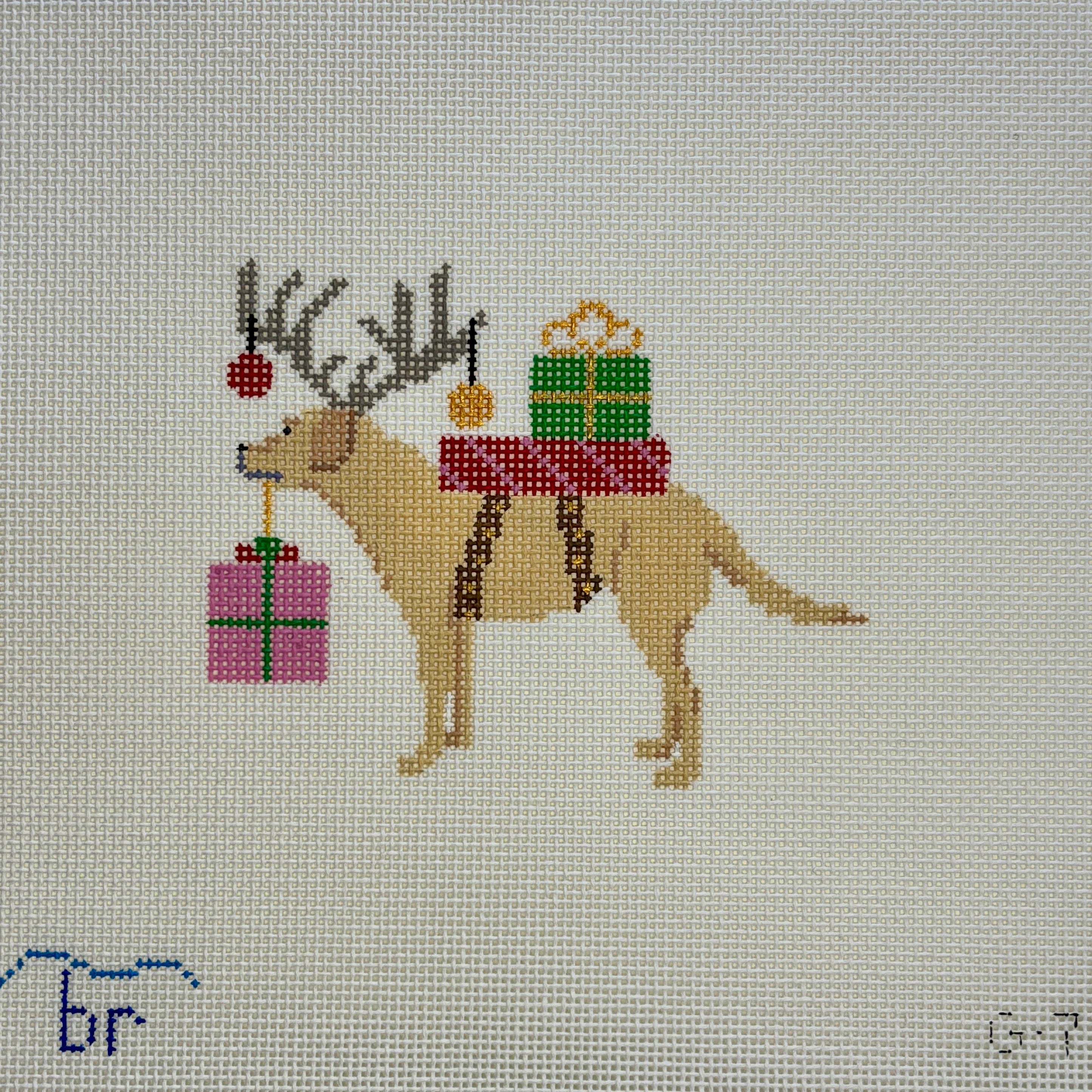 This hand painted needlepoint canvas from Blue Ridge Stitchery features a handsome Labrador dog carrying Christmas gifts and wearing reindeer antlers.