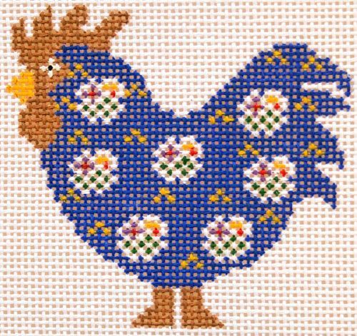 A beautiful hand painted needlepoint canvas from Cooper Oaks Design featuring a petite rooster with floral pattern on blue.