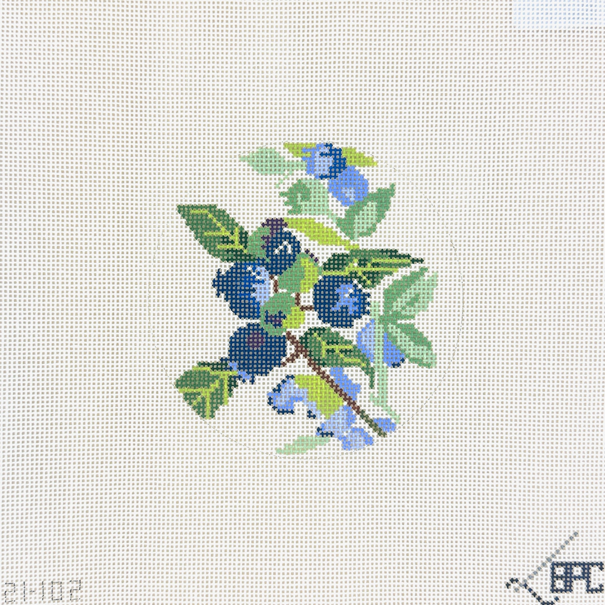 This is a hand painted needlepoint canvas by Blueberry Point. It features a round blueberry motif.