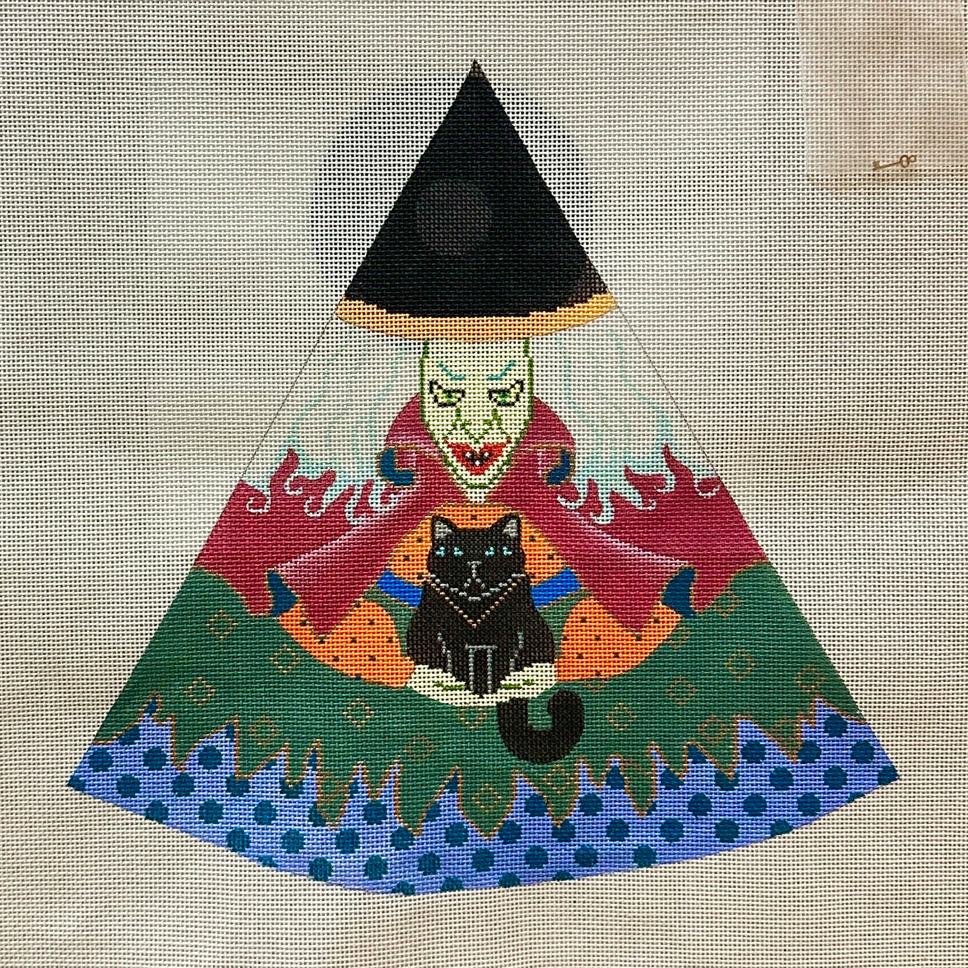 This hand painted needlepoint canvas by Brenda Stofft Designs features a witch holding a black cat. It's designed to be finished into a 3d cone with a brimmed hat.