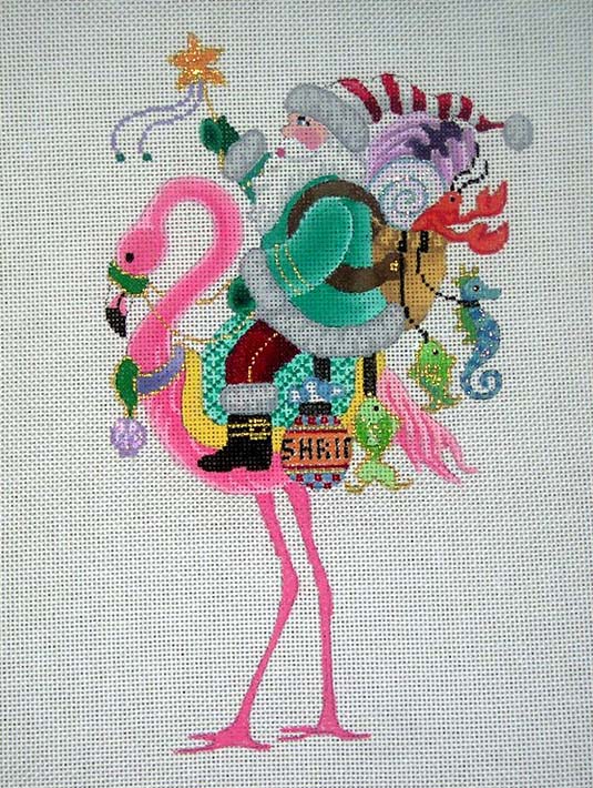 This hand painted needlepoint canvas by Brenda Stofft Designs features a Santa riding on a pink flamingo.