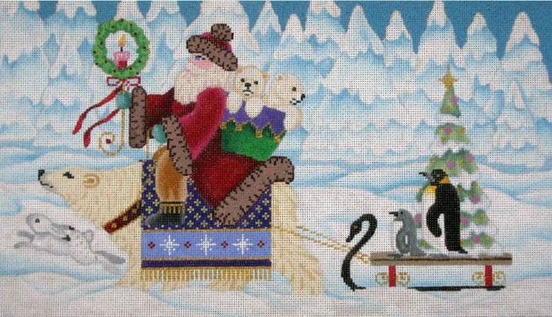 This hand painted needlepoint canvas by Brenda Stofft Designs features a Santa riding a polar bear pulling a sled of penguins and a Christmas tree.