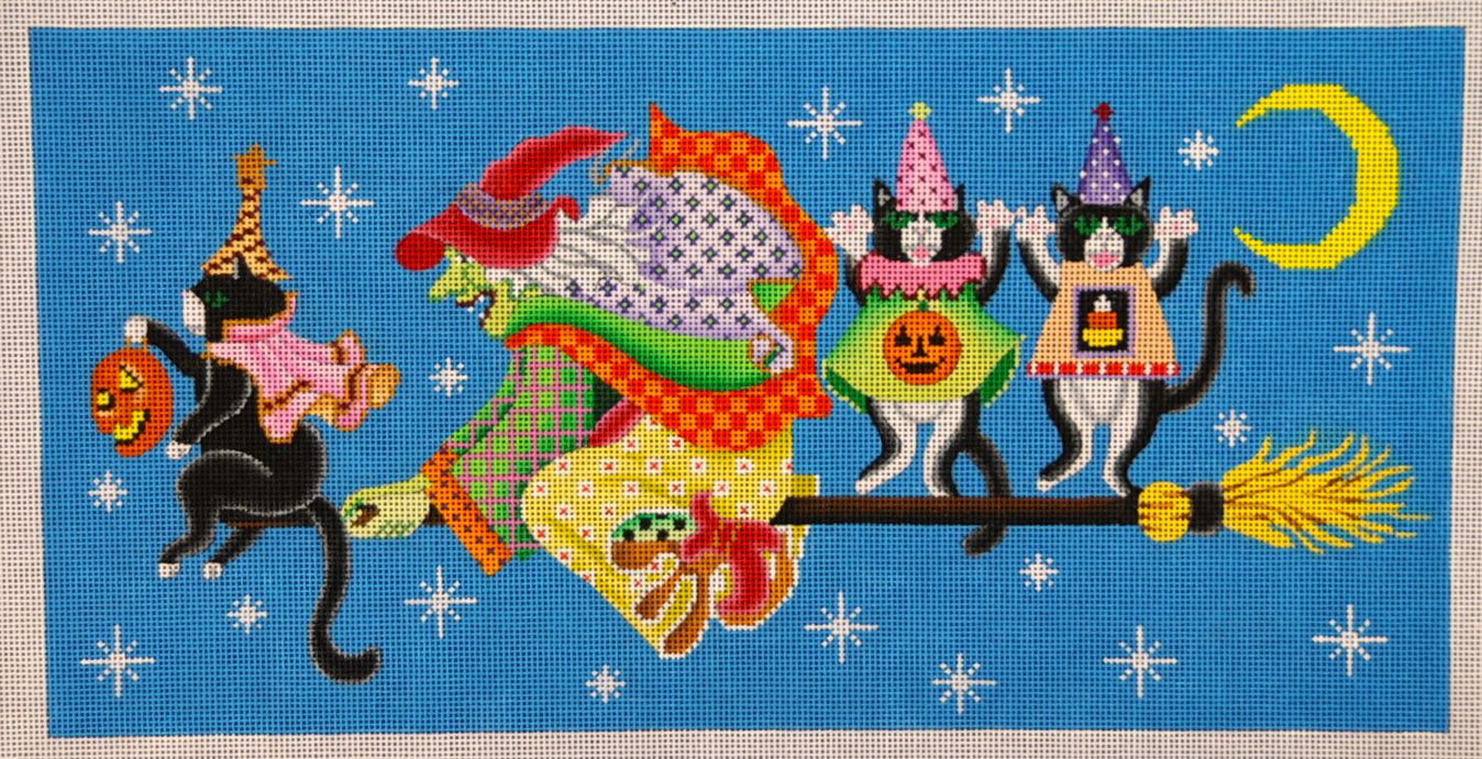 This hand painted needlepoint canvas by Brenda Stofft Designs features three cats on a broom with a witch.