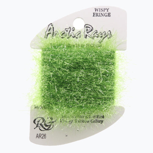 This is Arctic Rays from Rainbow Gallery in color 26 Kiwi. A high-texture accent thread - excellent for beards, fur, or garlands! 1 or 2 ply on 13 mesh, 1 ply on 18 mesh.