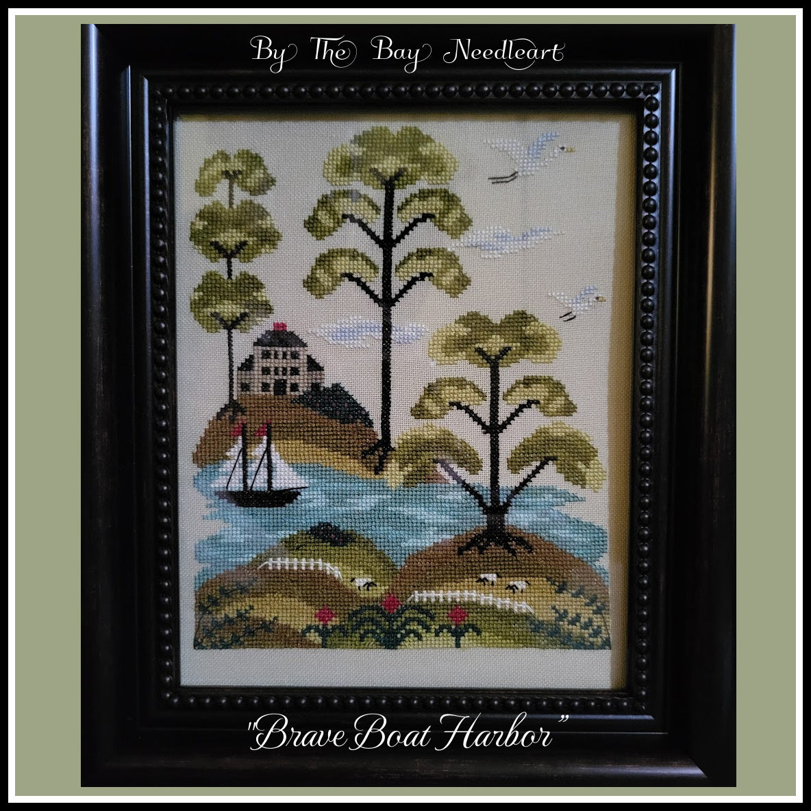 This is a printed cross stitch pattern by By The Bay Needleart. It features a quaint landscape scene with a cozy house on a hill overlooking a sailboat floating on a harbor and framed by fields dotted with sheep and flowers. The example as stitched uses DMC cotton floss on 28 count Laurel Green Zweigart Lugana.