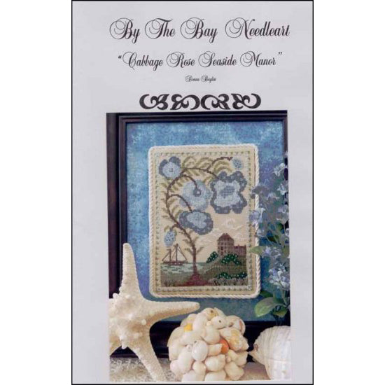 This is a printed cross stitch pattern by By The Bay Needleart. It features a blue cabbage rose curling in the foreground, against a seaside landscape with a sailboat and a manor in the background. The example as stitched uses DMC and Weeks Dye Works Floss on 32 count Lambswool Jobelan/Evenweave. A full DMC conversion is also included.