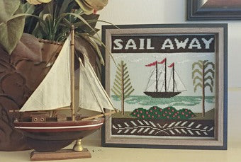 This is a printed cross stitch pattern by By The Bay Needleart. It features a sailboat, trees and the words "Sail Away". As stitched, the example uses DMC cotton flosses on 28 count linen in the color Star Sapphire by Wichelt.