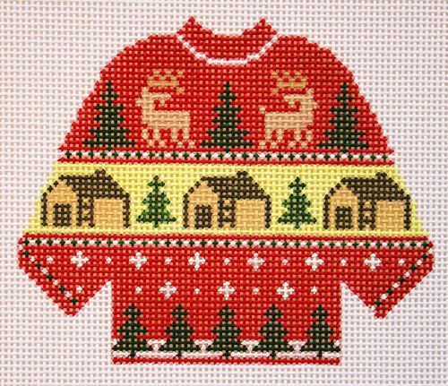 A beautiful hand painted needlepoint canvas from Silver Needle. Christmas Ornament. Sweater shaped ornament with decorations of cabins, evergreen trees and moose.