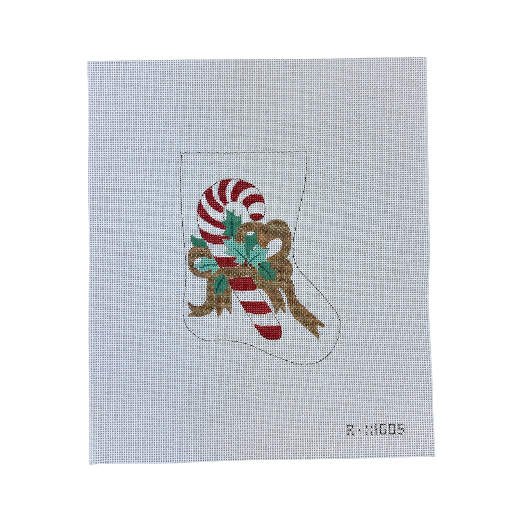 This hand painted needlepoint canvas features a mini stocking with a candy cane tied with a gold bow.