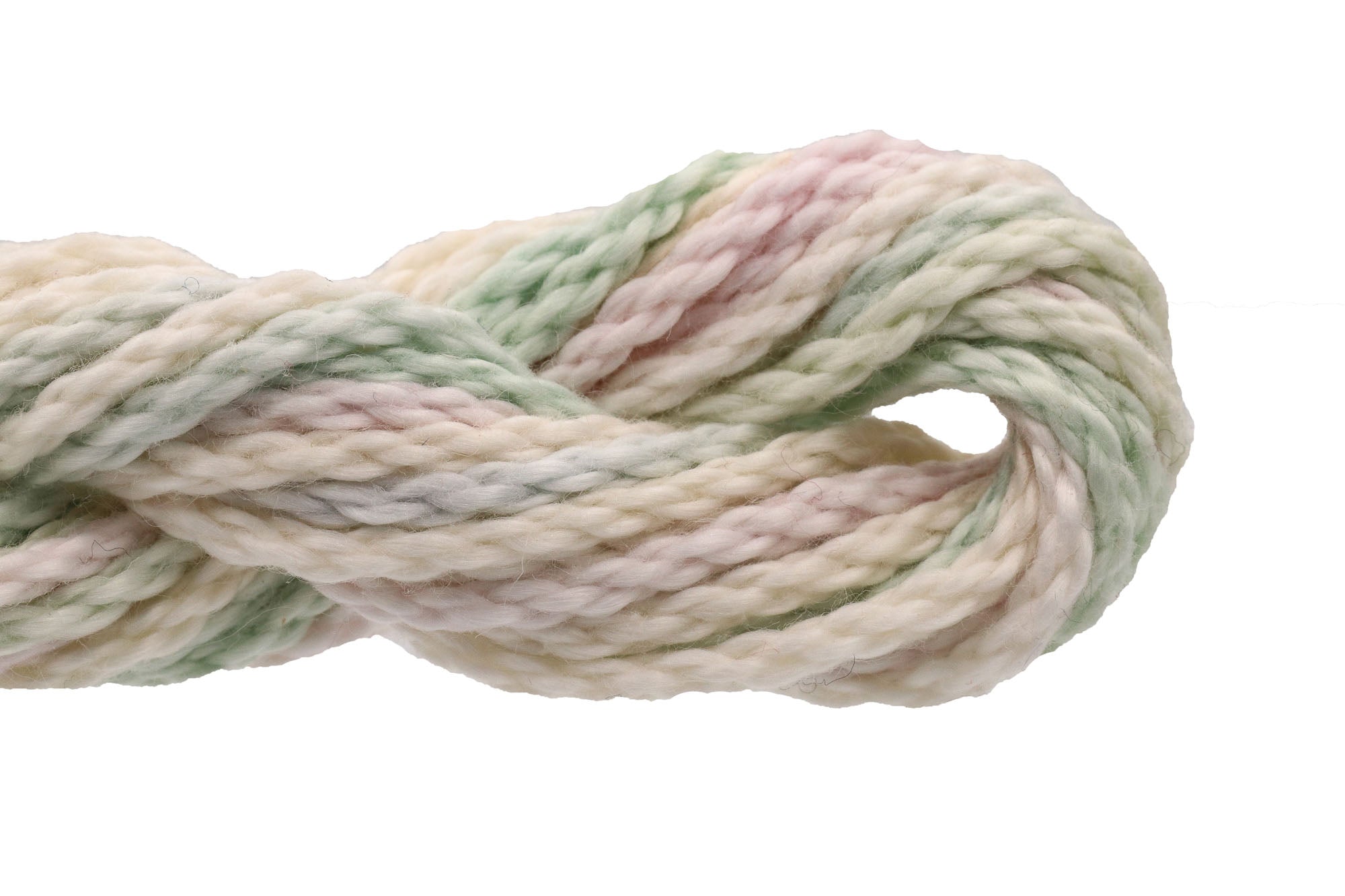 This is Watercolours from Caron Collection in color 126 Faded Linen. Rich variegated colors in stranded cotton. 2 strands on 13 mesh 1 strand on 18 mesh. 1 strand is about equivalent in size to #5 Perle Cotton.