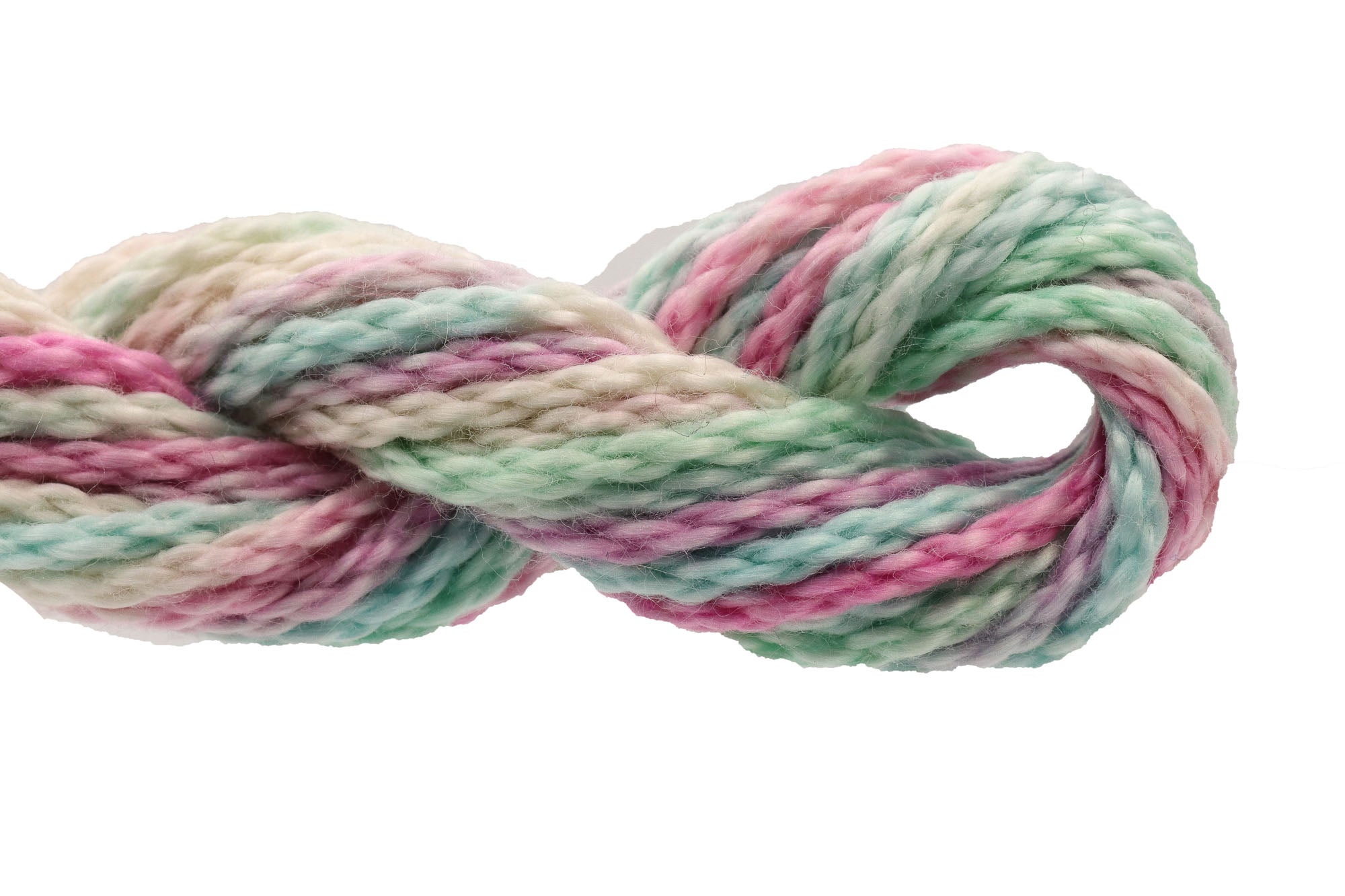 This is Watercolours from Caron Collection in color 002 Springtime. Rich variegated colors in stranded cotton. 2 strands on 13 mesh 1 strand on 18 mesh. 1 strand is about equivalent in size to #5 Perle Cotton.