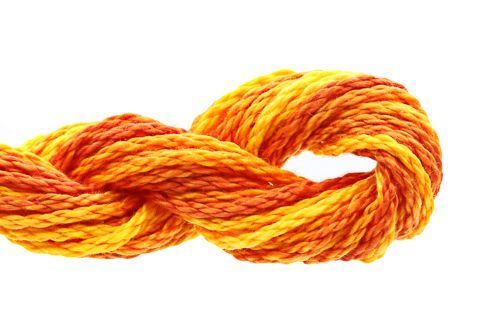 This is Watercolours from Caron Collection in color 280 Calabasa. Rich variegated colors in stranded cotton. 2 strands on 13 mesh 1 strand on 18 mesh. 1 strand is about equivalent in size to #5 Perle Cotton.