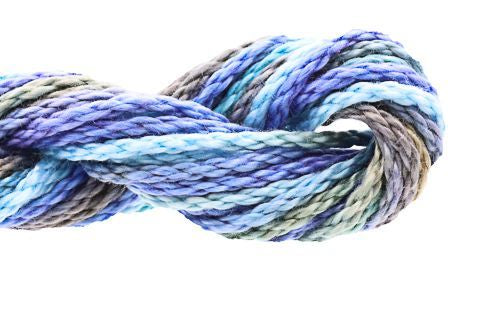 This is Watercolours from Caron Collection in color 289 Lexi's Blue. Rich variegated colors in stranded cotton. 2 strands on 13 mesh 1 strand on 18 mesh. 1 strand is about equivalent in size to #5 Perle Cotton.