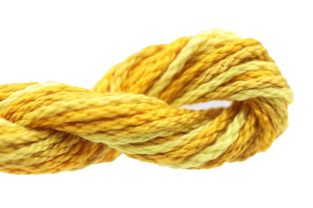 This is Watercolours from Caron Collection in color 322 Rapunzel. Rich variegated colors in stranded cotton. 2 strands on 13 mesh 1 strand on 18 mesh. 1 strand is about equivalent in size to #5 Perle Cotton.