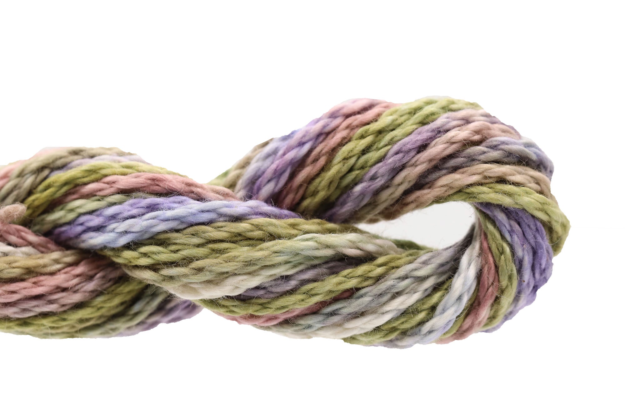 This is Watercolours from Caron Collection in color 064 Pale Lilac. Rich variegated colors in stranded cotton. 2 strands on 13 mesh 1 strand on 18 mesh. 1 strand is about equivalent in size to #5 Perle Cotton.