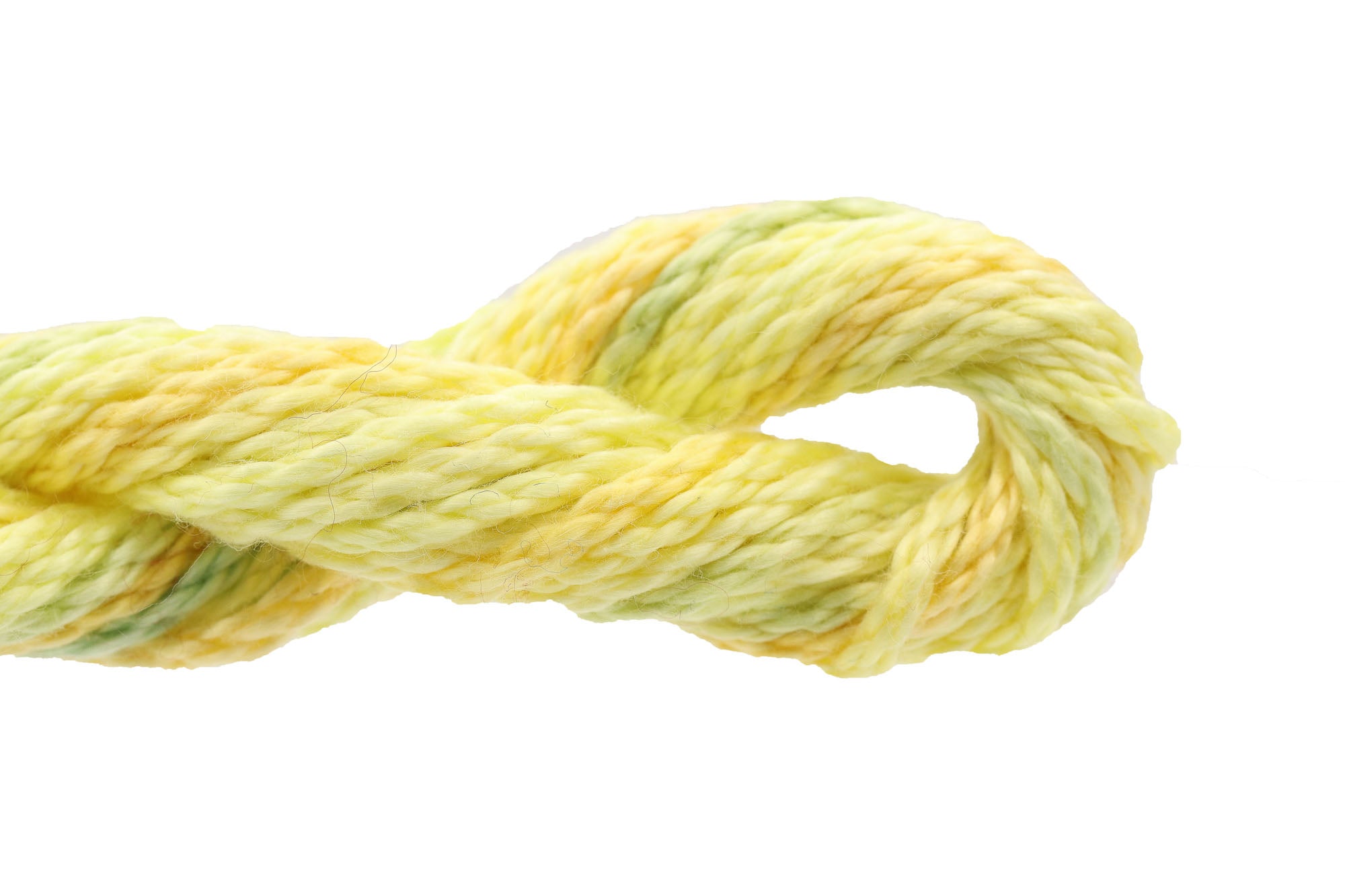 This is Watercolours from Caron Collection in color 094 Lem Meringue. Rich variegated colors in stranded cotton. 2 strands on 13 mesh 1 strand on 18 mesh. 1 strand is about equivalent in size to #5 Perle Cotton.