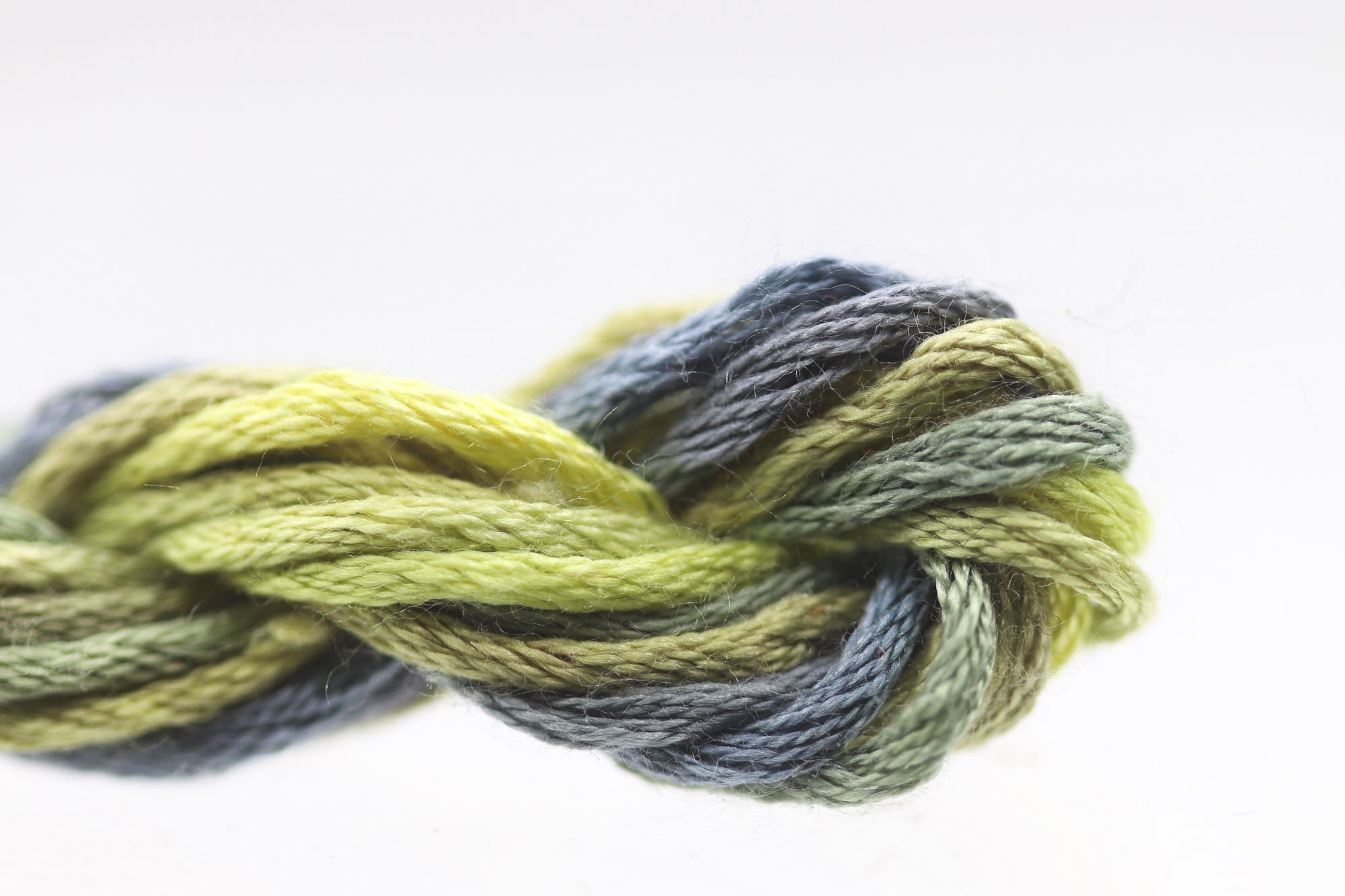 This is Waterlilies from Caron Collection in color 339 Zucchini. Rich variegated colors in stranded silk. 6 strands on 13 mesh, 3 or 4 on 18 mesh.