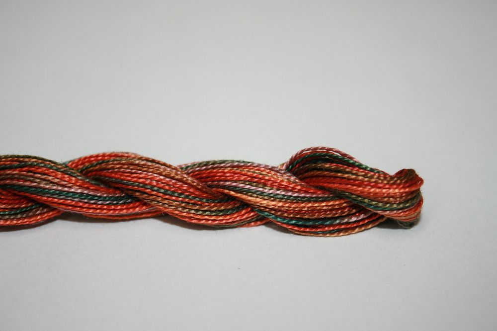 This is Wildflowers from Caron Collection in color 010 Fiesta. Rich variegated colors in thin cotton. 3 or 4 ply on 13 mesh, 1 or 2 ply on 18 mesh. About equivalent in size to #8 Perle Cotton.