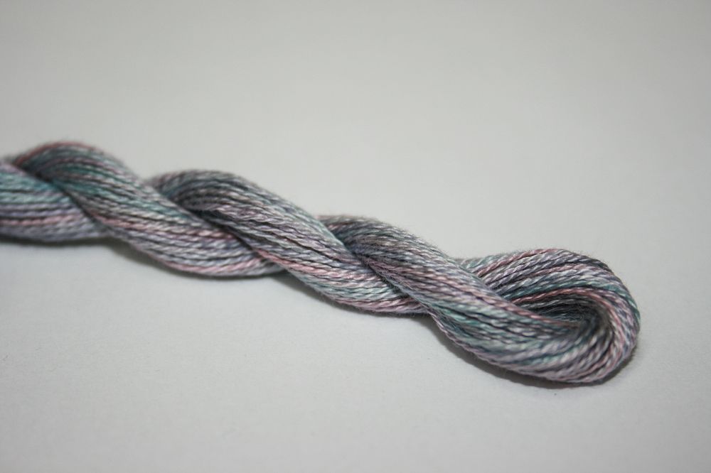 This is Wildflowers from Caron Collection in color 011 Pebbles. Rich variegated colors in thin cotton. 3 or 4 ply on 13 mesh, 1 or 2 ply on 18 mesh. About equivalent in size to #8 Perle Cotton.