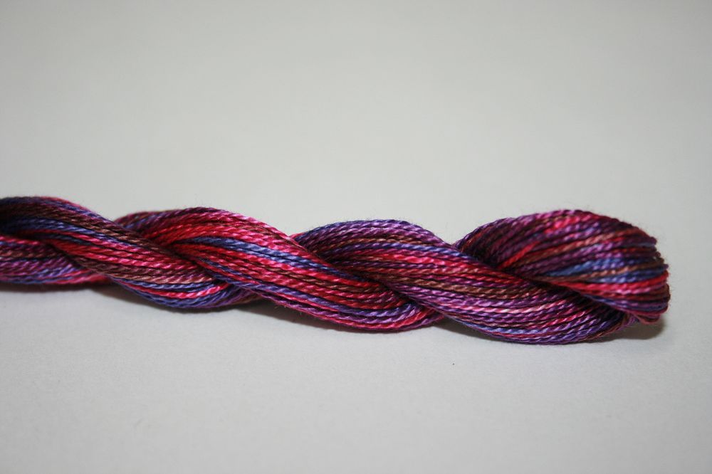 This is Wildflowers from Caron Collection in color 012 Wildberries. Rich variegated colors in thin cotton. 3 or 4 ply on 13 mesh, 1 or 2 ply on 18 mesh. About equivalent in size to #8 Perle Cotton.