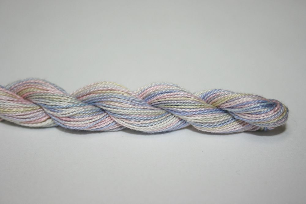 This is Wildflowers from Caron Collection in color 013 Peach Sherbet. Rich variegated colors in thin cotton. 3 or 4 ply on 13 mesh, 1 or 2 ply on 18 mesh. About equivalent in size to #8 Perle Cotton.