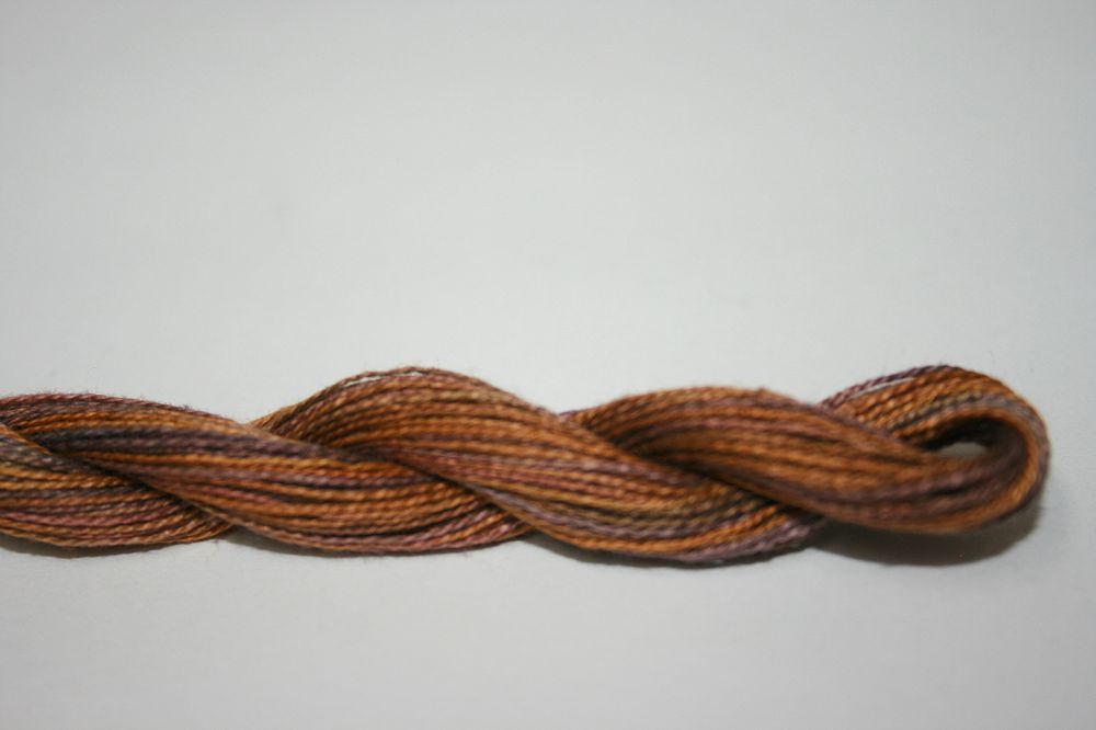 This is Wildflowers from Caron Collection in color 138 Winter Wheat. Rich variegated colors in thin cotton. 3 or 4 ply on 13 mesh, 1 or 2 ply on 18 mesh. About equivalent in size to #8 Perle Cotton.
