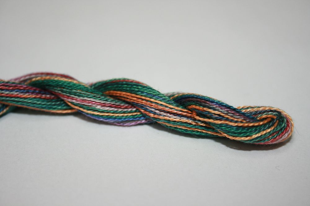 This is Wildflowers from Caron Collection in color 015 Deep Sunset. Rich variegated colors in thin cotton. 3 or 4 ply on 13 mesh, 1 or 2 ply on 18 mesh. About equivalent in size to #8 Perle Cotton.