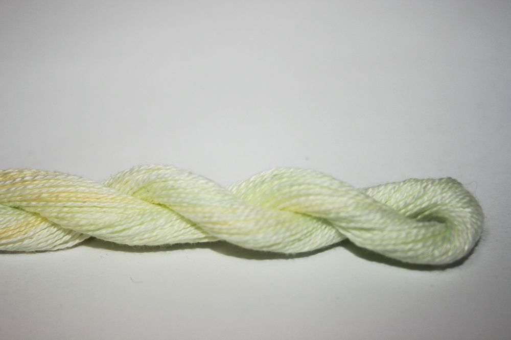 This is Wildflowers from Caron Collection in color 167 Lime Ice. Rich variegated colors in thin cotton. 3 or 4 ply on 13 mesh, 1 or 2 ply on 18 mesh. About equivalent in size to #8 Perle Cotton.