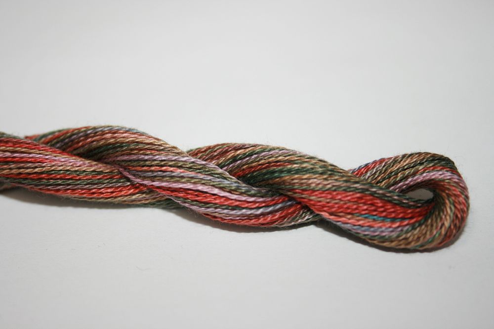 This is Wildflowers from Caron Collection in color 168 Rainforest. Rich variegated colors in thin cotton. 3 or 4 ply on 13 mesh, 1 or 2 ply on 18 mesh. About equivalent in size to #8 Perle Cotton.