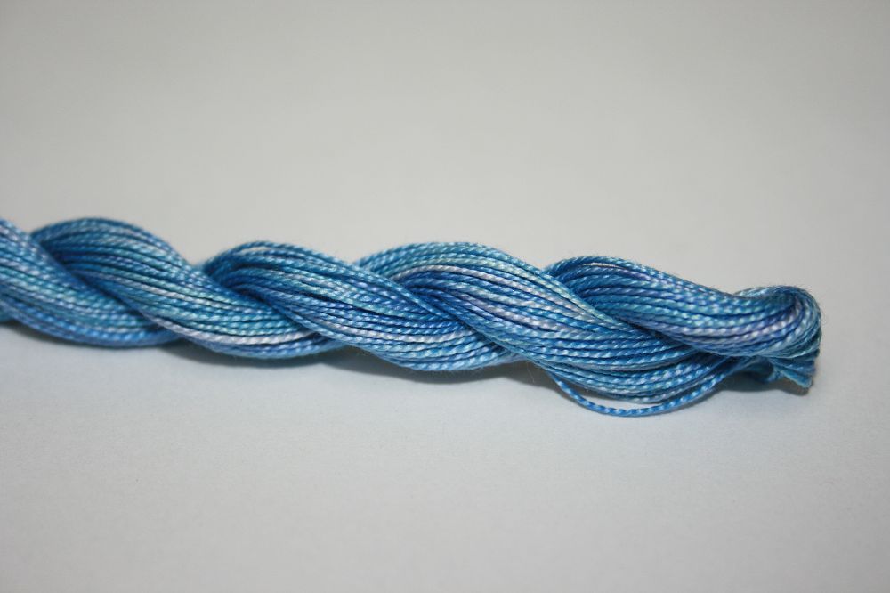 This is Wildflowers from Caron Collection in color 017 Blue Lavender. Rich variegated colors in thin cotton. 3 or 4 ply on 13 mesh, 1 or 2 ply on 18 mesh. About equivalent in size to #8 Perle Cotton.