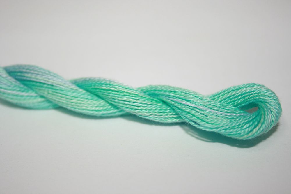 This is Wildflowers from Caron Collection in color 181 Ocean Breeze. Rich variegated colors in thin cotton. 3 or 4 ply on 13 mesh, 1 or 2 ply on 18 mesh. About equivalent in size to #8 Perle Cotton.